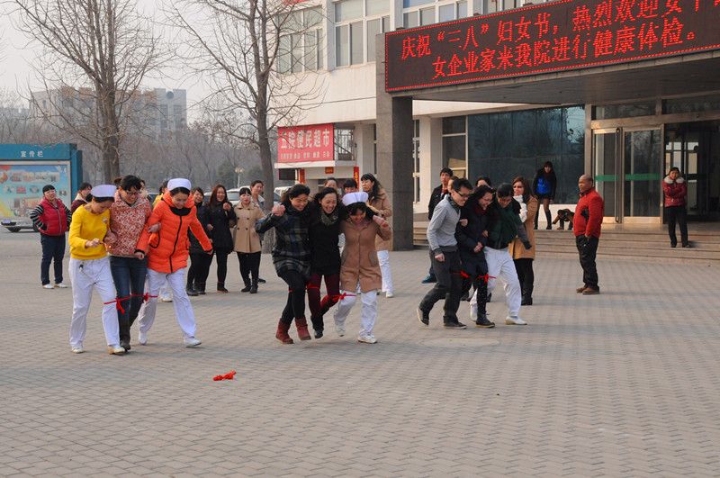 阳春三月 ,到处洋溢着浓浓的春意。在“三八”妇女节来临之际,为了让全院女职工度过一个愉快、温馨的节日,2014年3月6日下午,我院工会组织全院职工开展了热闹非凡的“庆三八”娱乐活动,活动项目有拔河比赛、三人绑腿跑。拔河比赛由6女2男组成一个小组,三人绑腿跑由2女1男组成一个小组。在活动比赛中,各参赛队员充分发挥自身优势,怀着必胜的心情,齐心协力,心往一处想,劲往一处使,努力拼搏,在旁边观看的职工也大声呐喊助威,为每一个参赛队加油,活动现场非常热闹,笑声不断,十分开心,获胜的队员还高高兴兴地领取了纪念品。娱乐活动不仅增进了职工之间的感情,促进了医院和谐健康的工作氛围,而且还丰富了职工的精神文化生活,提升了职工的凝聚力和战斗力,展示了我院医务人员良好的精神风貌。