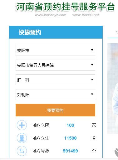 3、登录网址WWW.169000.NET进入“河南省预约挂号服务平台”网站;左上方“快捷预约”下拉菜单中选择城市、医院、和要预约的科室、医生,点击“我要预约”进入预约页面,开始预约。