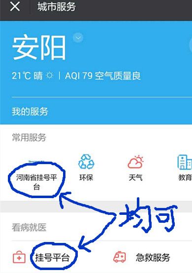 4、打开手机微信→“钱包”→“城市服务”→常用服务中“河南省挂号平台”或看病就医中“挂号平台”点击均可进行“河南省预约挂号服务平台”进行预约。