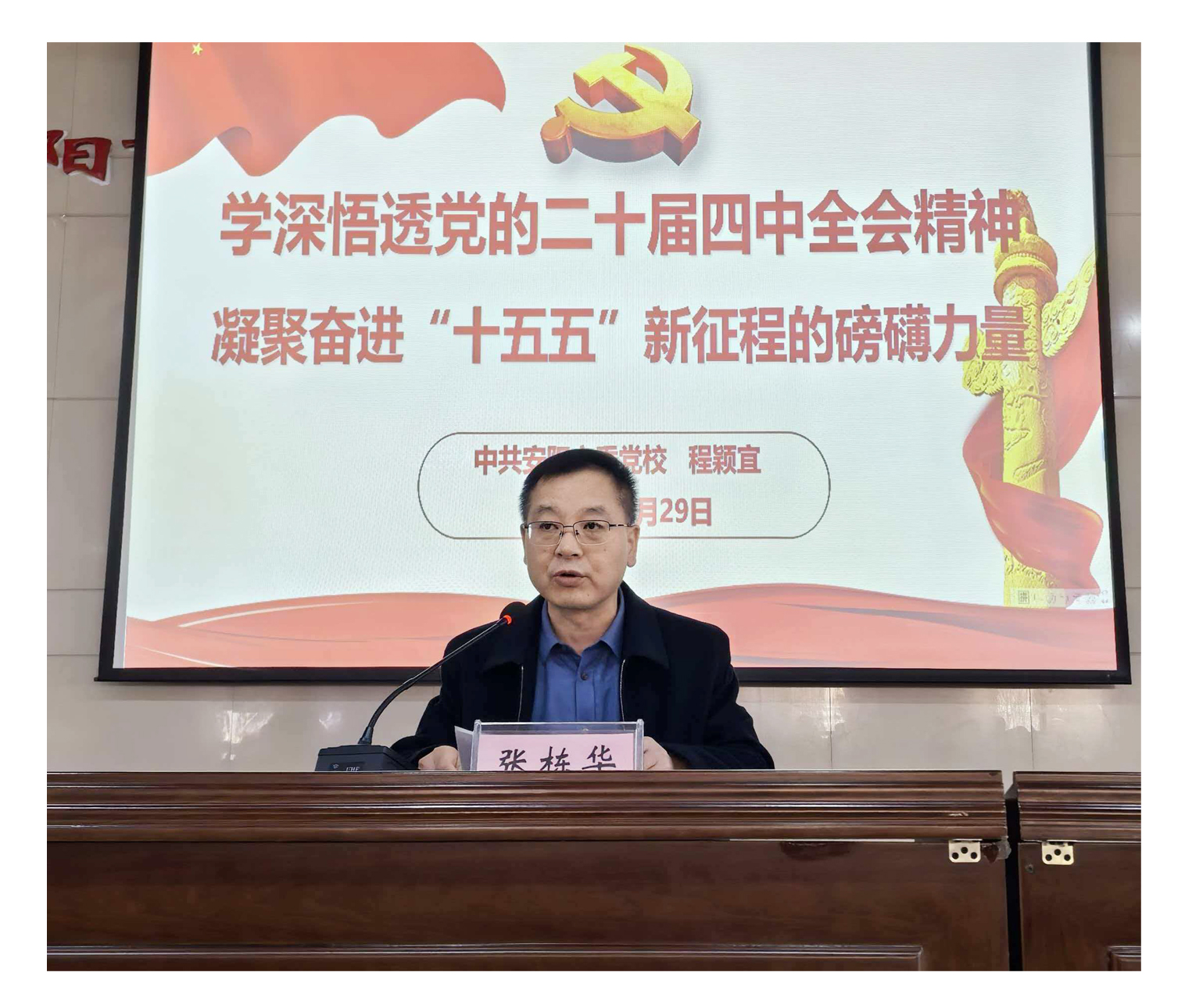 为深入学习领会党的二十届四中全会精神的核心要义与实践要求,引导全院干部职工切实把思想和行动统一到党中央的决策部署上来,12月29日,市五院在行政楼一楼会议室召开学习贯彻党的二十届四中全会精神宣讲报告会。会议由党委书记张栋华主持并作总结讲话。中共安阳市委党校马克思主义基础理论教研部主任、副教授程颖宜应邀作专题宣讲报告,全院党员及中层干部参加会议。