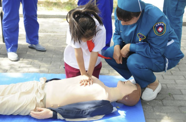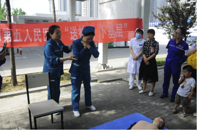 冯淑杰医师现场讲解突发异物气道梗阻时“海姆立克急救法”及上肢外伤”包扎固定法”。