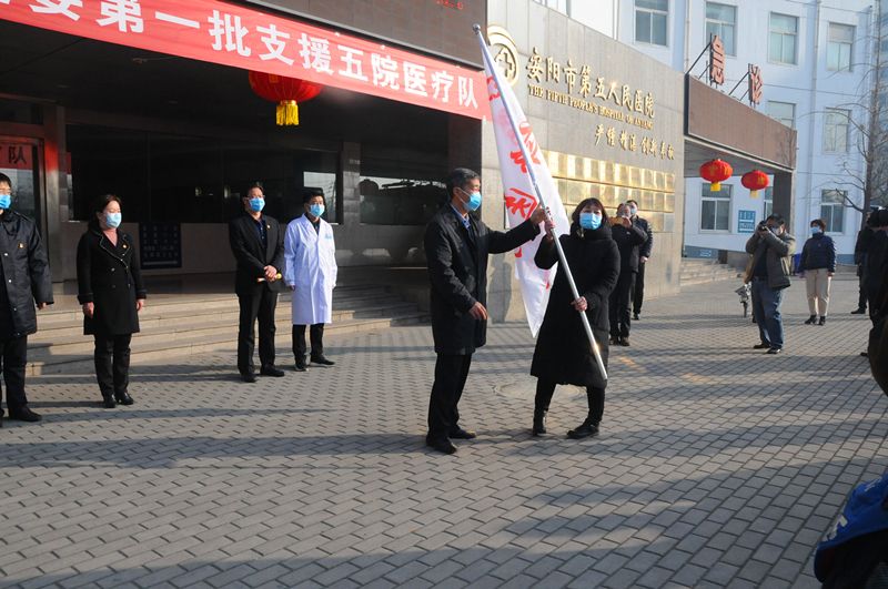 1月31日上午9时,市卫健委第一批驰援五院应急医疗队授旗仪式在我院门诊楼广场进行。市新型冠状病毒感染的肺炎疫情防控指挥部办公室副主任、市卫健委党组书记、主任王永斌、综合协调组常务副组长、市卫健委党组成员、副主任张金文、医疗救治组副组长王霞,我院党委副书记、院长吕运海、党委书记李永红、全体应急医疗队员及部分队员派出单位的负责同志参加了授旗仪式。仪式由市卫健委医政医管科科长戴东华主持。