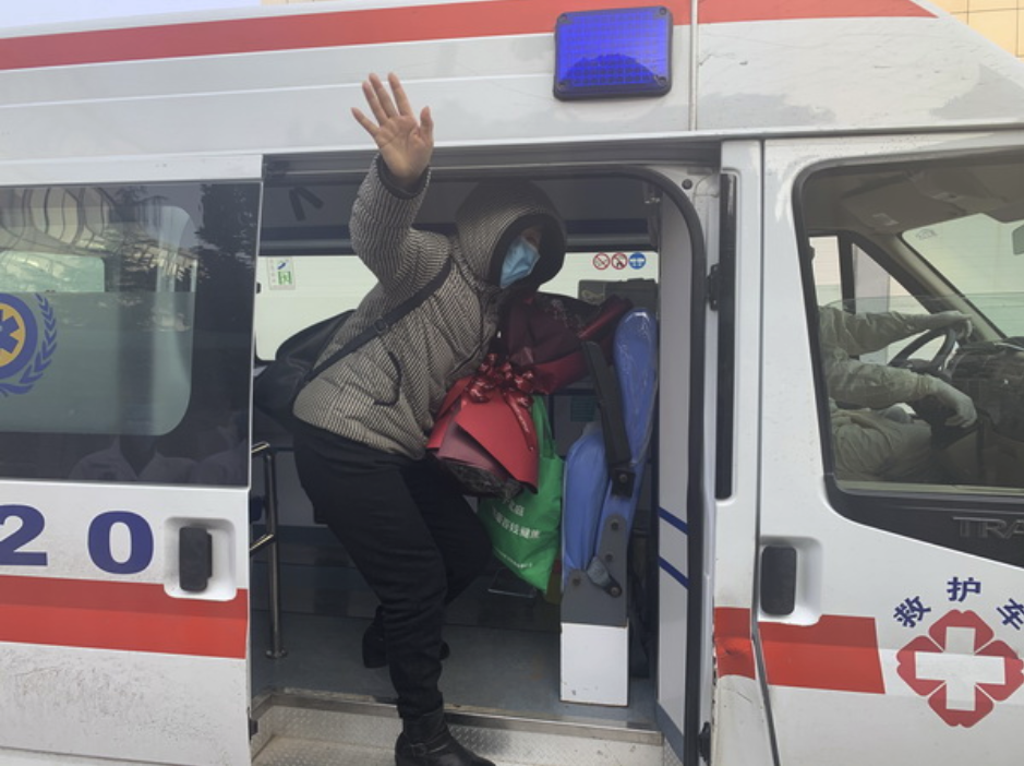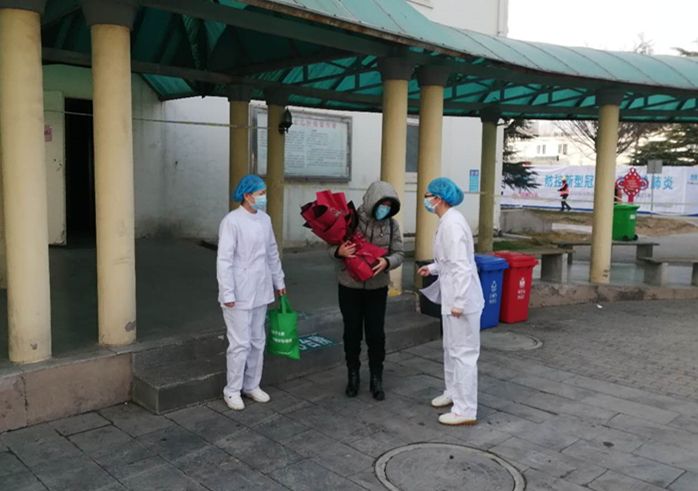 当患者走出病房时,医护人员上前向其赠送鲜花表示祝贺,同时嘱咐她要规范隔离观察。注意勤洗手,讲卫生,常通风,加强营养,提高免疫力,如有不适,随时与医护人员联系。患者手捧鲜花向辛勤治疗照顾她的医护人员鞠躬致谢,登上救护车向所有欢送她的医务人员挥手致谢!
