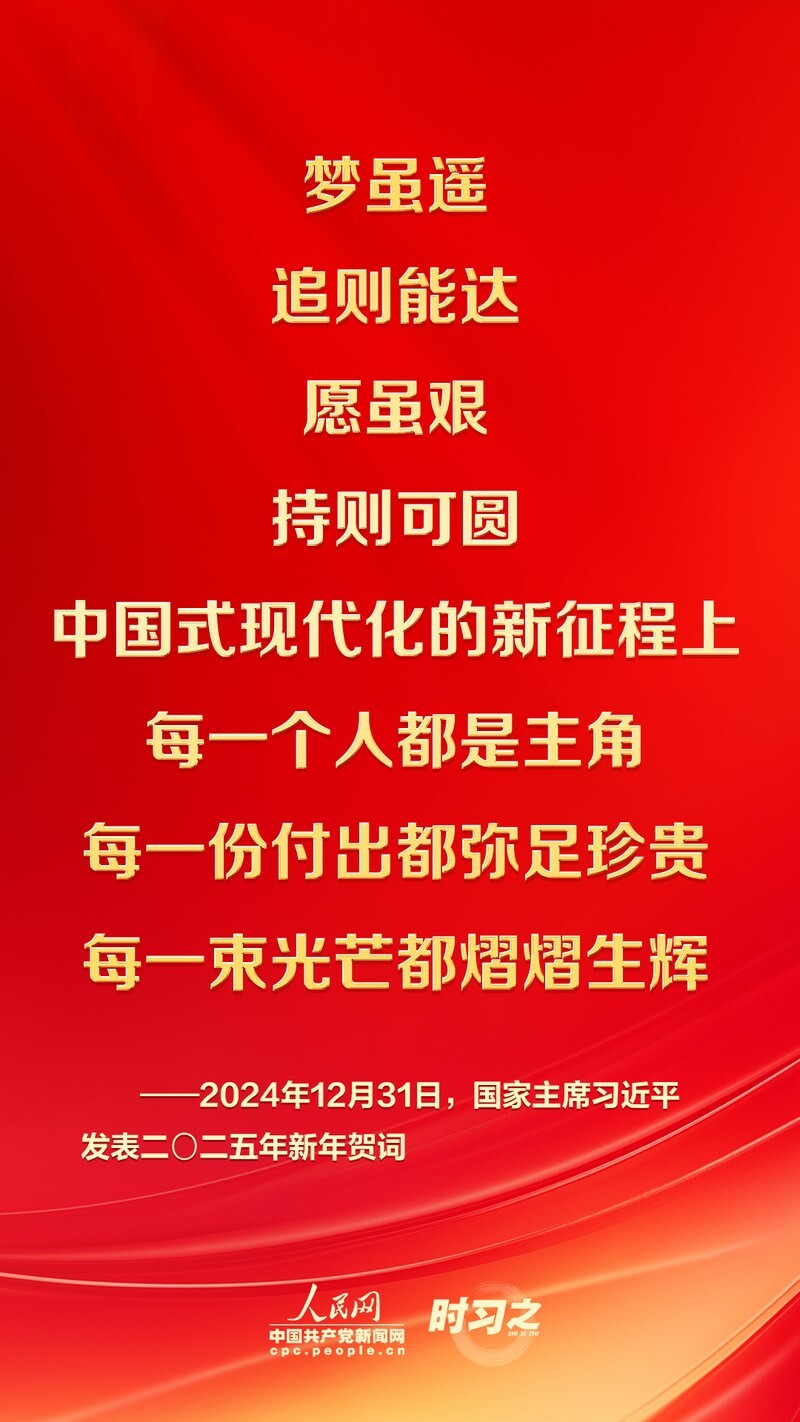 2024年12月31日晚,国家主席习近平发表二〇二五年新年贺词。习近平主席回顾了2024年中国取得的不平凡成就,激励全国人民“梦虽遥,追则能达;愿虽艰,持则可圆。中国式现代化的新征程上,每一个人都是主角,每一份付出都弥足珍贵,每一束光芒都熠熠生辉。”殷切的关怀、深情的祝福,给人力量、催人奋进。